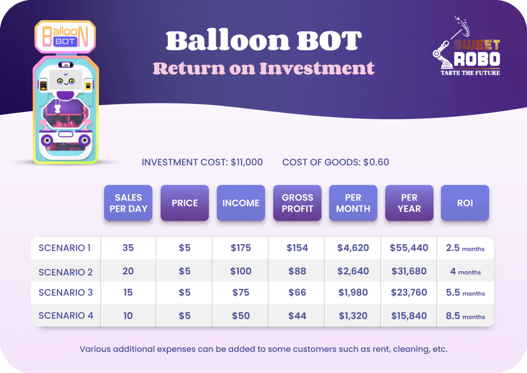 Balloon BOT's lightweight design and ease of transport mean it can be effortlessly moved, it works like a magnet, drawing in crowds and brightening up spaces, turning even the most overlooked spots into centers of excitement and activity. Its self service model provides a continuous revenue stream with very little expense.