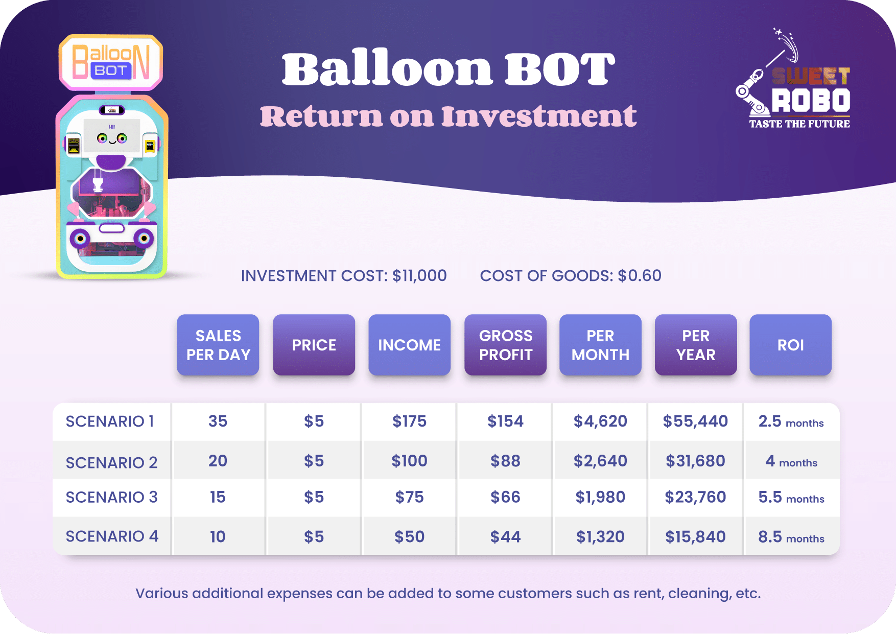 With no staffing required and minimal maintenance, the Balloon BOT is a cost efficient way to add value to any business. Its self service model provides a continuous revenue stream with very little expense.