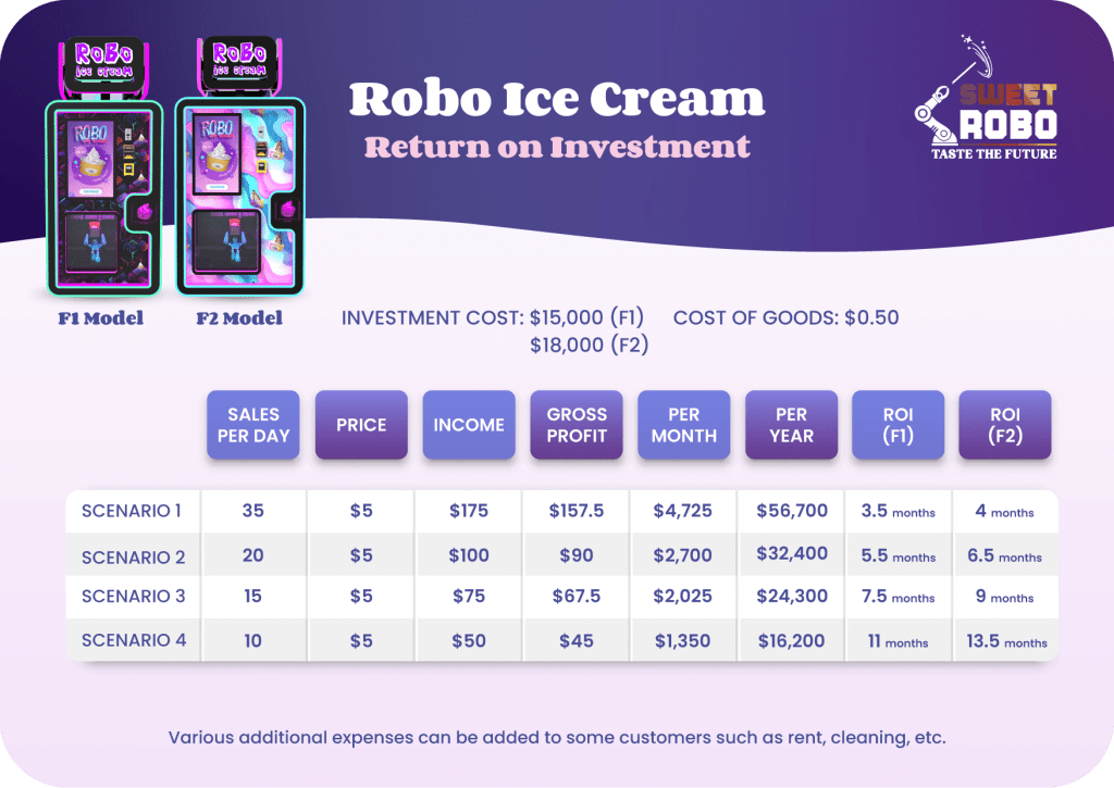 With no staffing requirement and low maintenance, the Robo Ice Cream machine represents a lean operation with robust profitability, churning out high-margin treats without additional labor costs.